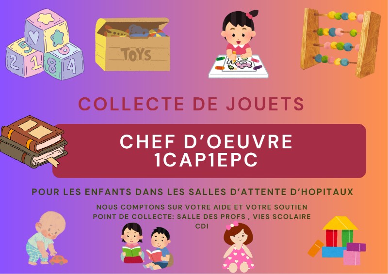 Les élèves de 1CAP1EPC vous informent de leur projet collecte de jouets. Depuis novembre 2025, ils ont installé, dans le lycée, plusieurs points de collecte pour des jouets (livres pour enfants, Peluches, jeux de société, poupées, voitures, puzzles...) au profit des centres hospitaliers et de l’association la Croix Rouge.